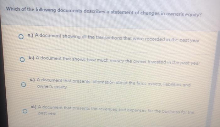 Which best describes an owners equity in the property. Which of the following best describes financial performance of an entity a. Equity Assets - Liabilities.